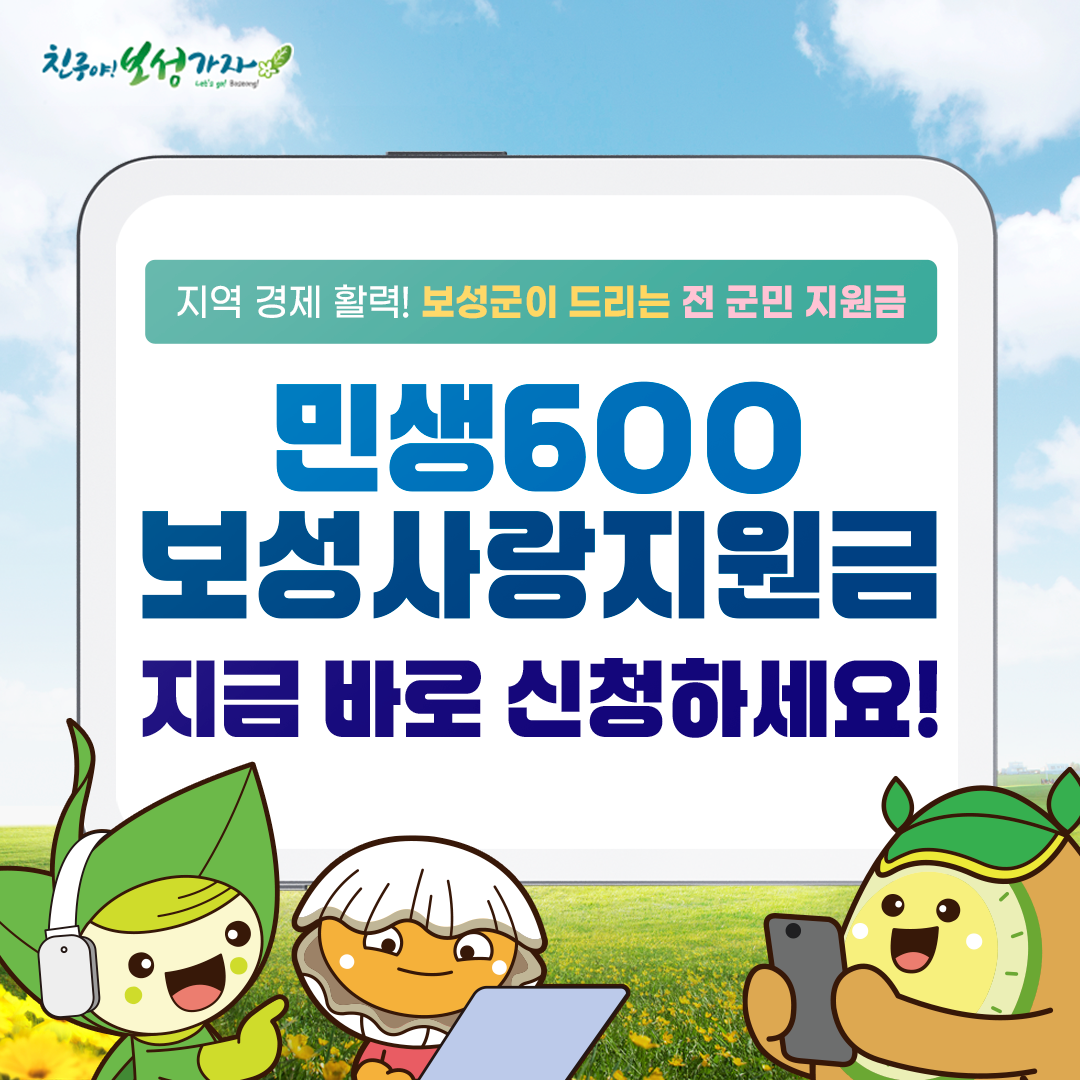 연말연시 정국 혼란에 따른 지역경제의 어려움으로 위축된 민생을 안정화하고 지역 경제 활성화를 위한 돌파구 마련을 위해 민생600 보성사랑지원금을 군민에게 지원합니다.
